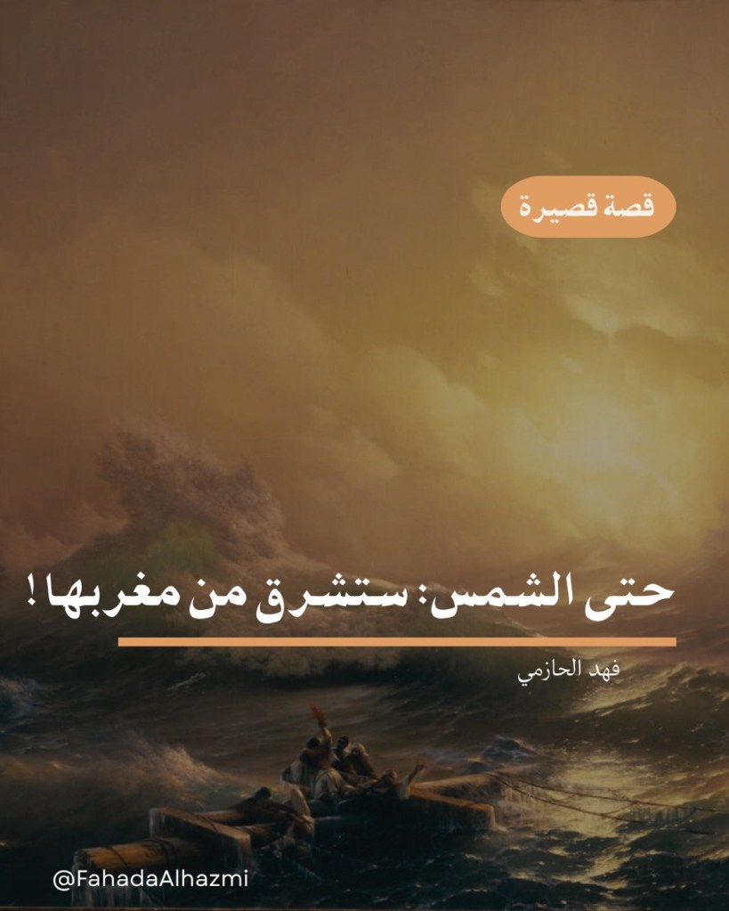 كان تائها يمضي ذهابًا وعودة في الحدائق المجاورة لمنزله، صبح مساء، طرد من وظيفته نتيجة للغيابات المتكررة، و قد تبقى القليل من مدخراته الوظيفية ومستحقاته، عقله صار يعمل بسرعة مهولة تفكيرا في كل شيء، وروحه مضطربة مشتتة لا تدري كيف الخراج، وصل إلى البحر ، تأمل الشمس قبل الغروب، وتذكر أنه يحب الغروب لكنه غاب عن البحر، طوال فترة زواجه الروتيني الهادئ، ليعود الآن إليه، وفي لحظة من الصفاء والتجلي الضائع، تذكر تعجبّه الشديد أواخر المرحلة الابتدائية، عندما تطرق معلم لمسألة شروق الشمس من الغرب في آخر الزمان، وتذكر جيدا شعوره في ذلك الحين وكافة الأفكار التي حيّرته في هذا الشأن، وأحس فجأة بأنه فهم كل شيء، الدين والناس والعالم والحياة، وأنه بالفعل – كما أحس – ينبغي أن تشرق الشمس من مغربها يومًا ما !